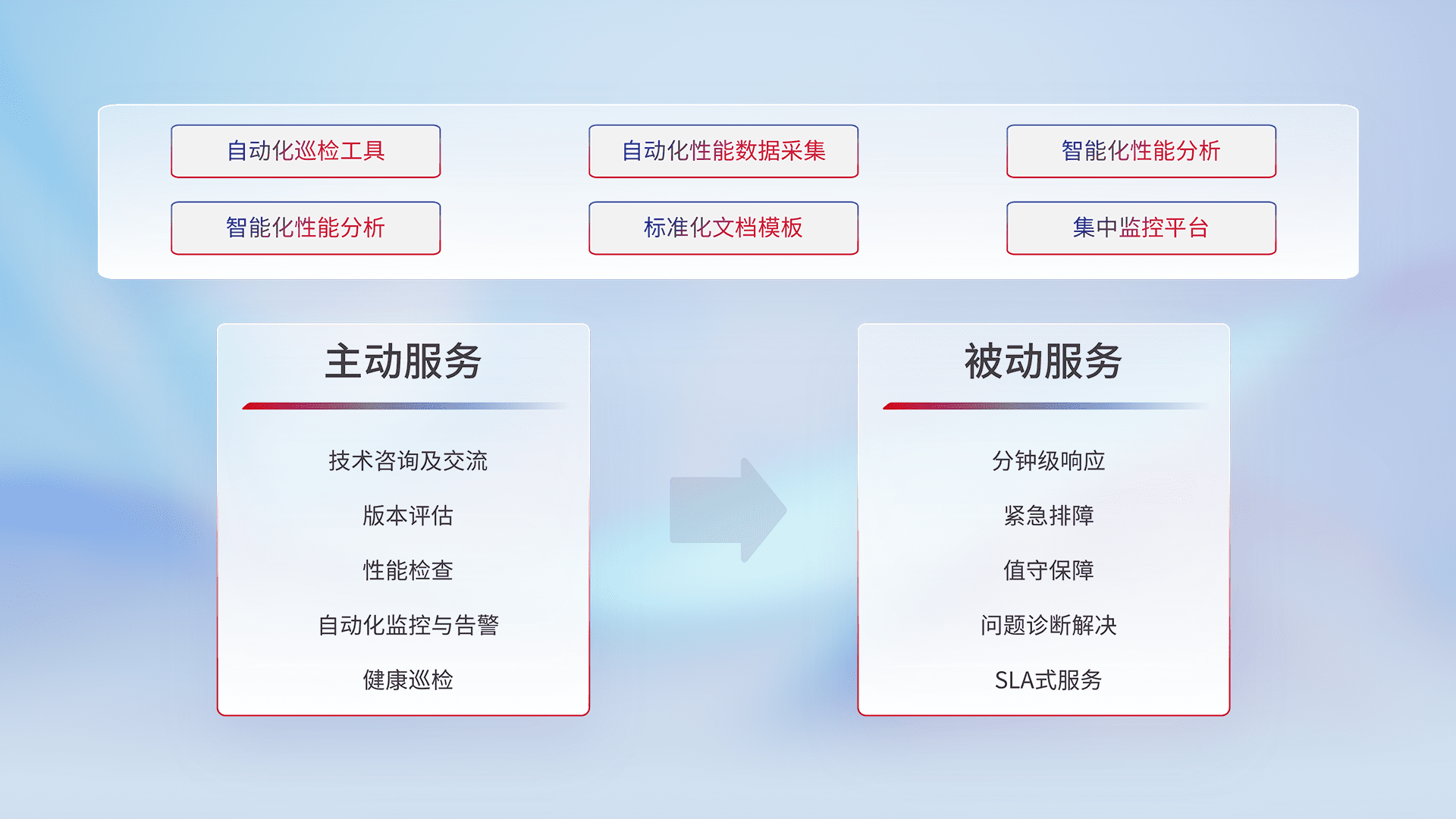智能化工具和标准化文档,,,,保障服务质量,,,提供主动服务(包含技术咨询、、、版本评估、、、性能检查、、、自动化监控与告警、、、健康巡检)和被动服务包含(分钟级响应、、紧急排障、、值守保障、、、问题诊断解决、、、、SLA服务)。。。。
